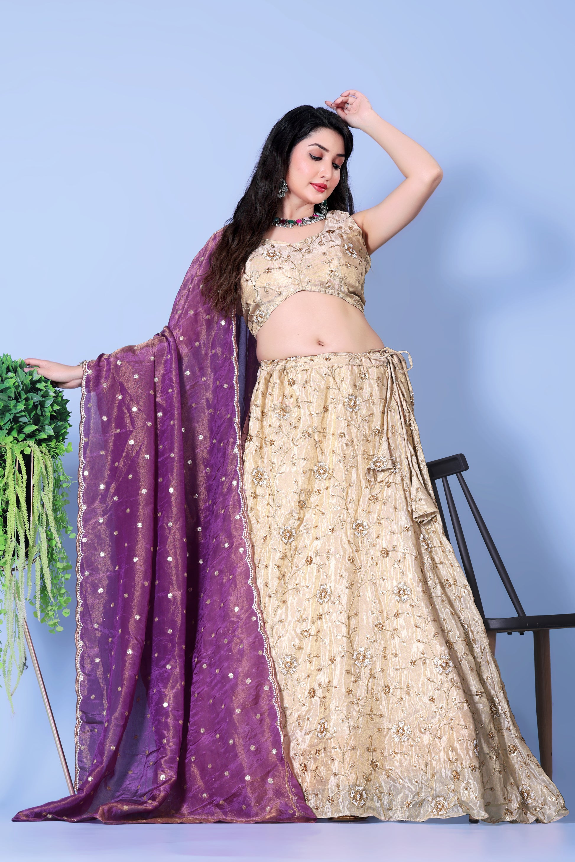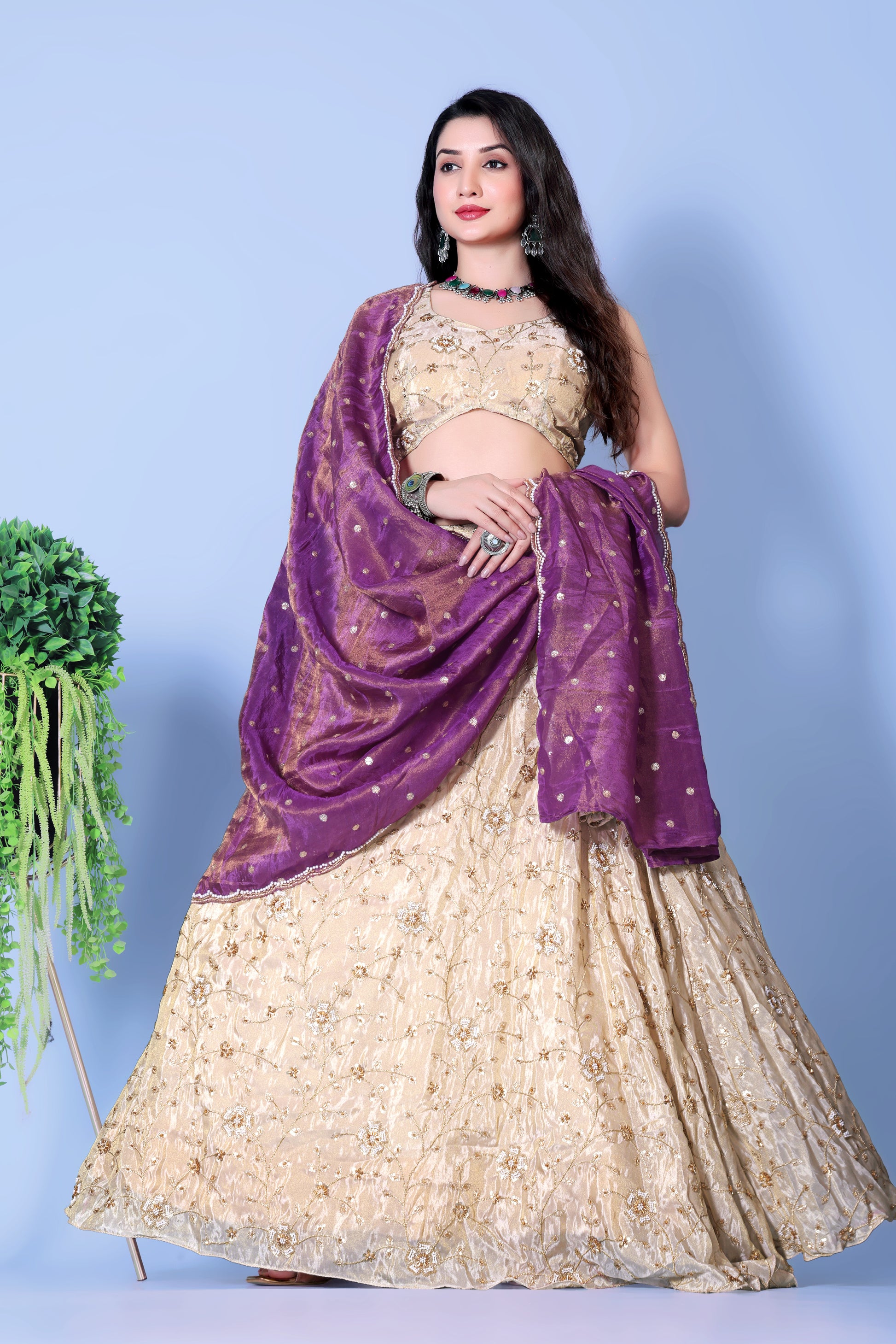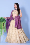 Embrace elegance and tradition with this stunning Purple and Mint Embroidered Silk Lehenga. The luxurious silk fabric drapes beautifully, offering a smooth and sophisticated look, while the intricate embroidery adds a touch of glamour and artistry to the ensemble.